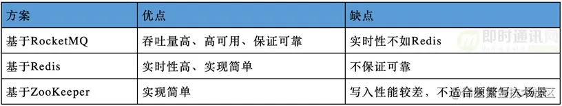 实现广播可以选择基于RocketMQ的消息广播、基于Redis的Publish/Subscribe、基于ZooKeeper的通知等方案,其优缺点对比如下表所示。从吞吐量、实时性、持久化、实现难易等方面考虑,最终选择了RocketMQ。