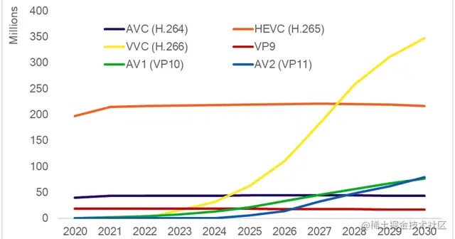 图2显示了预计的全球设备使用费,其中不包括LCEVC,因为它只包括完整的编解码器,而不包括通过增强层提供的编解码器(下面我将进一步讨论LCEVC)。这些预测出人意料地看好VVC,尽管预计它将在2029年超过HEVC。关于VP9、AV1和AV2使用费,报告指出:“尽管AOMedia提出反对,但我们目前预计Sisvel在收取这些费用方面将取得重大进展。尽管如此,我们仍希望AV1能大幅增长。”