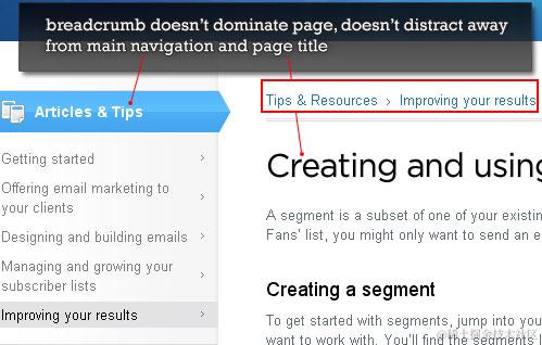 面包屑路径只是一个辅助的导航工具,所以谁都不希望他占据巨大的页面空间,他应该尽量的小,但是要能够方便访问,向用户传达出这种辅助的设计意图。一个原则就是,用户浏览页面时,不能第一眼就被面包屑路径所吸引。