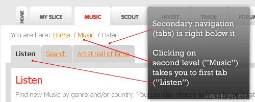 面包屑路径只是一种导航的辅助手段,任何时候都不应该取代导航菜单。上图中就是一个例子,由于只使用了面包屑路径,当用户想跳转到站点的其他栏目时,很难容易的到达。