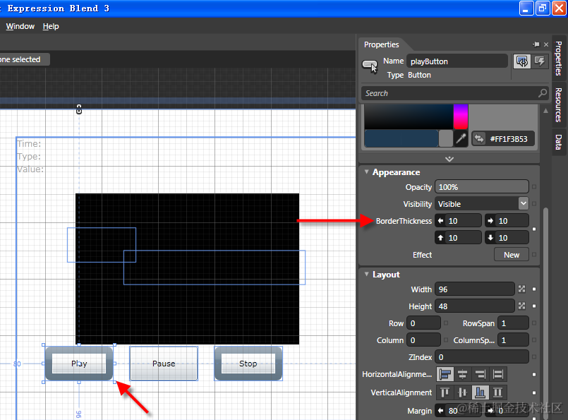 第一个方法很简单,我们只需要在XAML中加入希望的样式,或者通过Expression Blend在右侧属性中进行修改就可以了。
