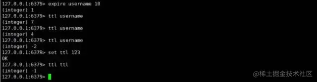 - ttl key 查看某个 key 的剩余时间,返回正数代表剩余的时间,-1代表永久,-2代表已过期或不存在。