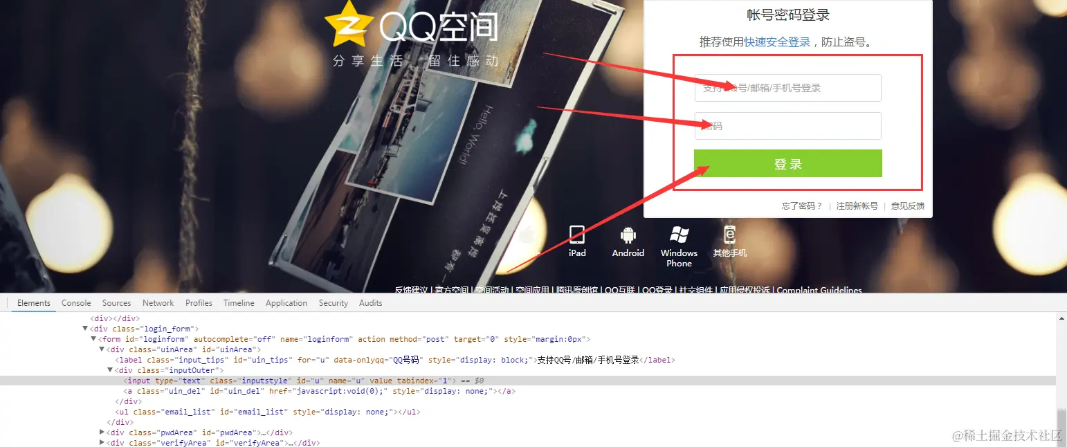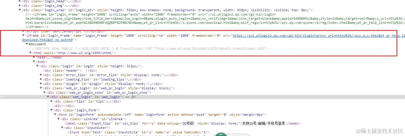 然后就是切换到iframe,QQ空间里面的登录区域实际上是一个iframe嵌入在里面