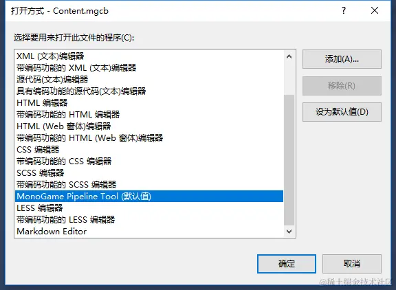 mgcb文件如果直接打开的话,会是一个文本文件,写了一些配置,不过MonoGame给我们提供了一个PipeLine 工具,VS里面右键->打开方式,然后选择 MonoGame pipeLine tools