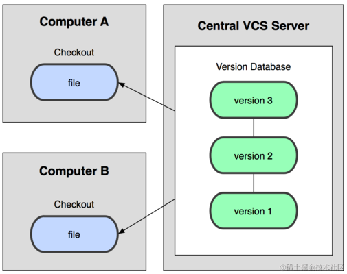 接下来人们又遇到一个问题,如何让在不同系统上的开发者协同工作?于是,集中化的版本控制系统(Centralized Version Control Systems)应运而生。这类系统,诸如CVS、Subversion等,都有一个单一的集中管理服务器,保存所有文件的修订版本,而协同工作的人们都通过客户端连到这台服务器,取出最新的文件或者提交更新。多年以来,这已成为版本控制系统的标准做法。