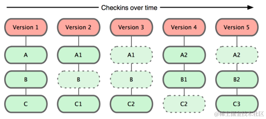 Git和其他版本控制系统的主要差别在于,Git只关心文件数据的整体是否发生变化,而大多数其他系统则只关心文件内容的具体差异。这类系统(CVS、Subversion等)每次记录都有哪些文件做了更新,以及更新了哪些行的什么内容,如下图: