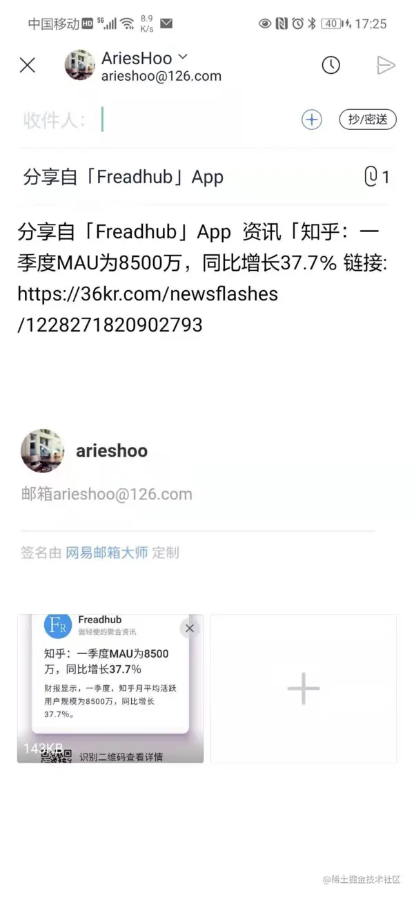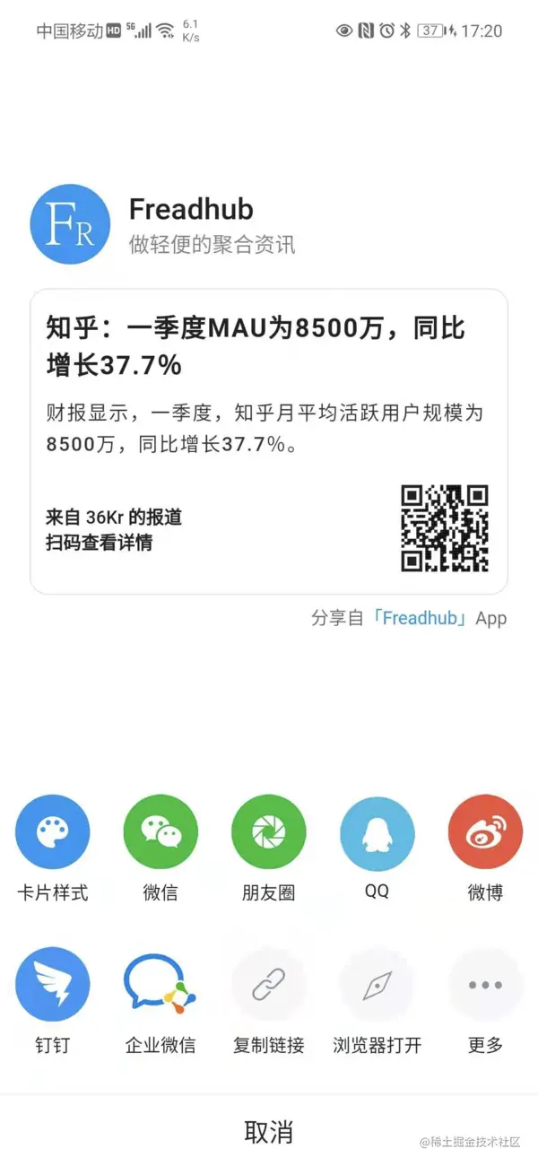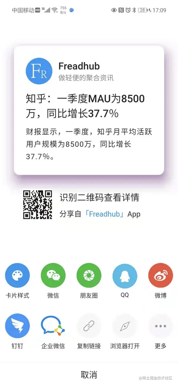 最新版本:资讯列表及资讯详情分享页支持卡片(图片)分享到微信好友、朋友圈、QQ、微博、钉钉、企业微信、更多等。--且内置Freadhub卡片样式及掘金卡片样式两种效果选择