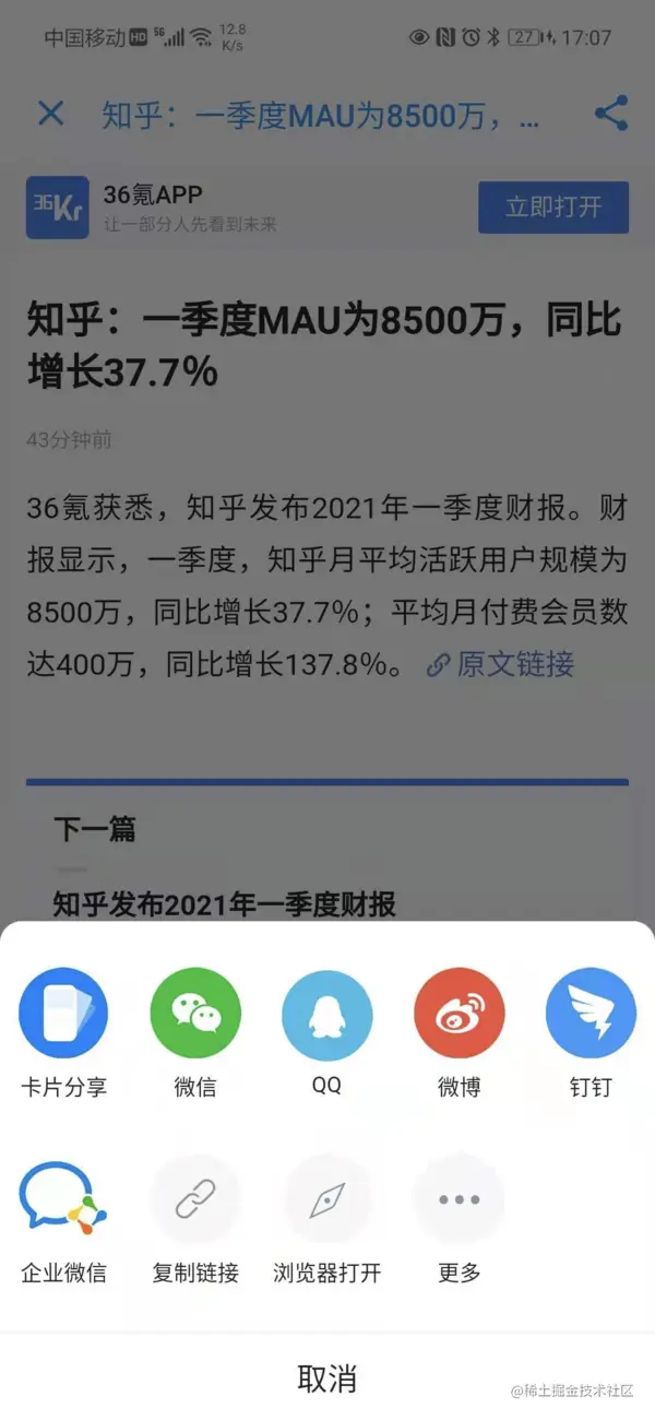 最新版本支持:资讯详情页分享文本链接到微信好友、QQ、微博、钉钉、企业微信、复制链接、浏览器打开、更多。