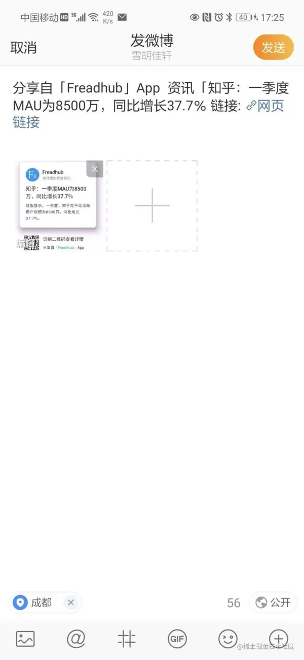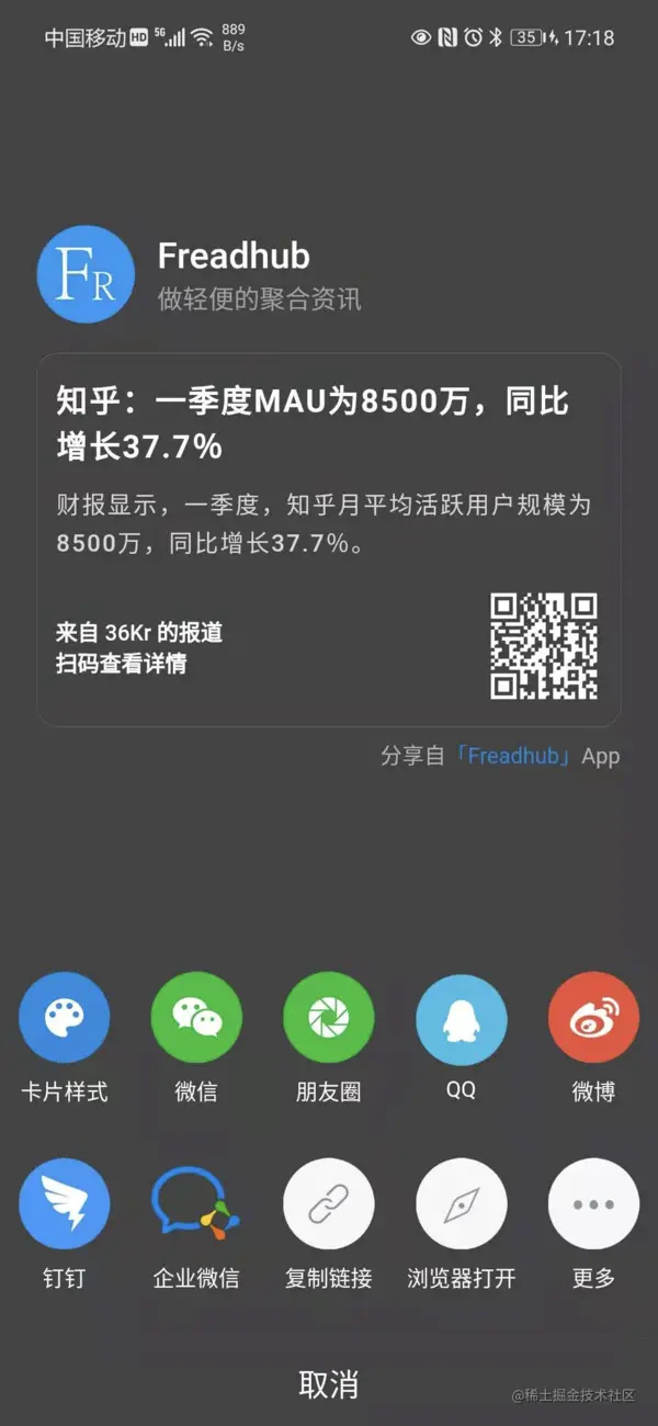 之前版本Freadhub只支持列表长按分享卡片模式,且不支持分享指定App(常见的QQ、微信、微博等)