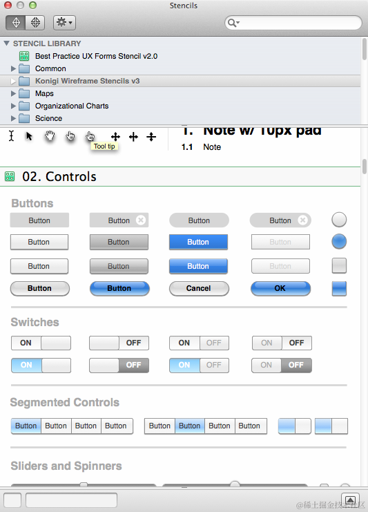 Stencils是OminiGraffle中的重要特性,可以帮助我们节省大量的时间。Stencils是我们可以拖动摆放的图片,多数是矢量图片。