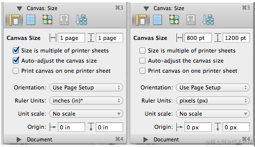 OmniGraffle的默认参数设置有些奇怪,所以一般需要修改一下页面的设置。选择Inspectors->Canvas->Size。