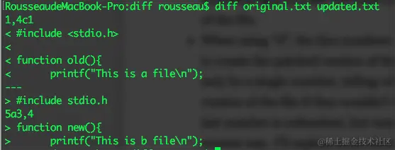 下面先对结果中出现的一些符号做一些解释。1,4c1,这个内容输出实际上是给patch看的,表示告诉patch在original.txt文件中的1到4行应当被updated.txt中的内容替换,替换的内容是updated.txt的第1行。这里可能会出现三个字母表示不同的意义,分别是c表示更新、a表示追加、d表示删除。