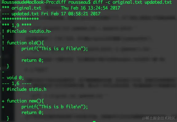 观察之前diff给出的结果样式,对于需要替换的位置,仅仅给出了行号,如果文件突然新增了一个空行,补丁应用的时候就会发生问题。另外一种情况,如果将补丁文件应用到了一个错误的源文件上,假如恰好这个文件有同样的行数,那么补丁也可以成功应用。而这都是我们不希望看到的结果。幸好,diff提供了一种不同的结果样式来避免上面的这些问题。