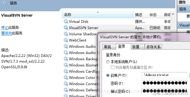 由此想到可能是权限的问题,任务管理器里查看服务,发现是“网络服务”用户组,可以在服务里修改一下权限。修改完成后记得重启一下服务,再试一下OK了。登录的用户只要是管理员组中的用户就可以,不一定必须是Administrator。