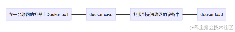 如果你的生产环境不能连通互联网,而你又希望从互联网上获取镜像。你就需要借助 docker save命令,可以将镜像导出为 tar 文件。使用 docker load 命令,可以将tar文件导入镜像库。整个流程是这样的:
