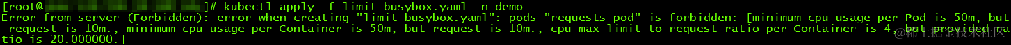 创建一个不符合LimitRange要求的Pod,则会出现以下报错。