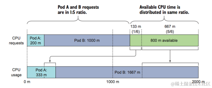 在没有设置资源使用限制的情况下,Pod可能使用超过请求的资源数量。对于CPU资源来说,如果同时有两个Pod请求剩余的资源,在分配剩余资源时,调度器会根据请求数量的比例在不同的Pod间分配资源。例如Pod A请求100m的CPU,Pod B请求20m的CPU,在两个Pod中CPU使用超过请求时,会根据5:1的比例分配。