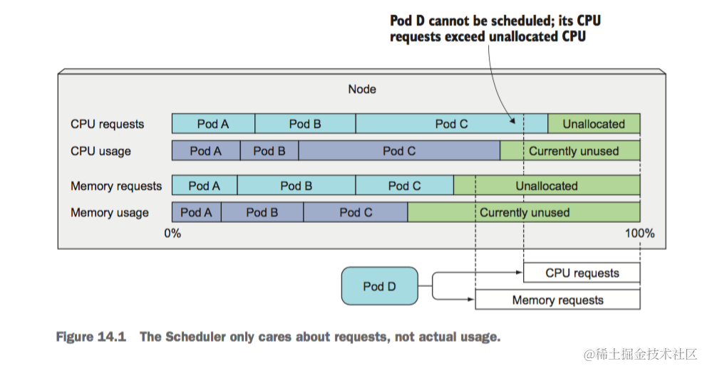 如果不指定CPU请求资源,表示不关心容器会分到多少CPU资源,有可能会一直分不到而处于等待状态。指定资源请求表示Pod对资源的最小需求,因此在调度的时候会如果Node剩余的资源不能满足Pod的需求,则不会调度到对应的Node上。Scheduler调度的时候并不关注在调度时具体的资源使用情况,而是根据现存Pod的资源请求情况来进行调度。这就会有问题,特别是当允许Pod使用超过请求的资源时。下面的图一看就能理解。