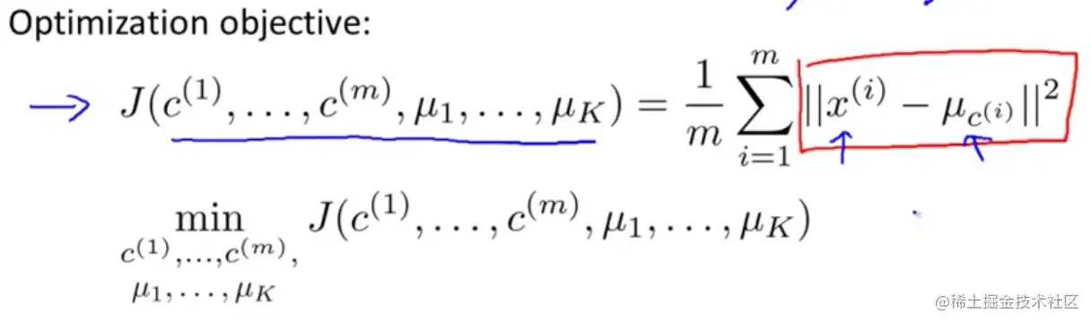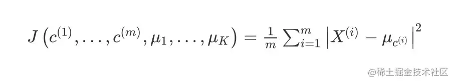 K-均值最小化问题,是要最小化所有的数据点与其所关联的聚类中心点之间的距离之和,因此 K-均值的代价函数(畸变函数Distortion function) :