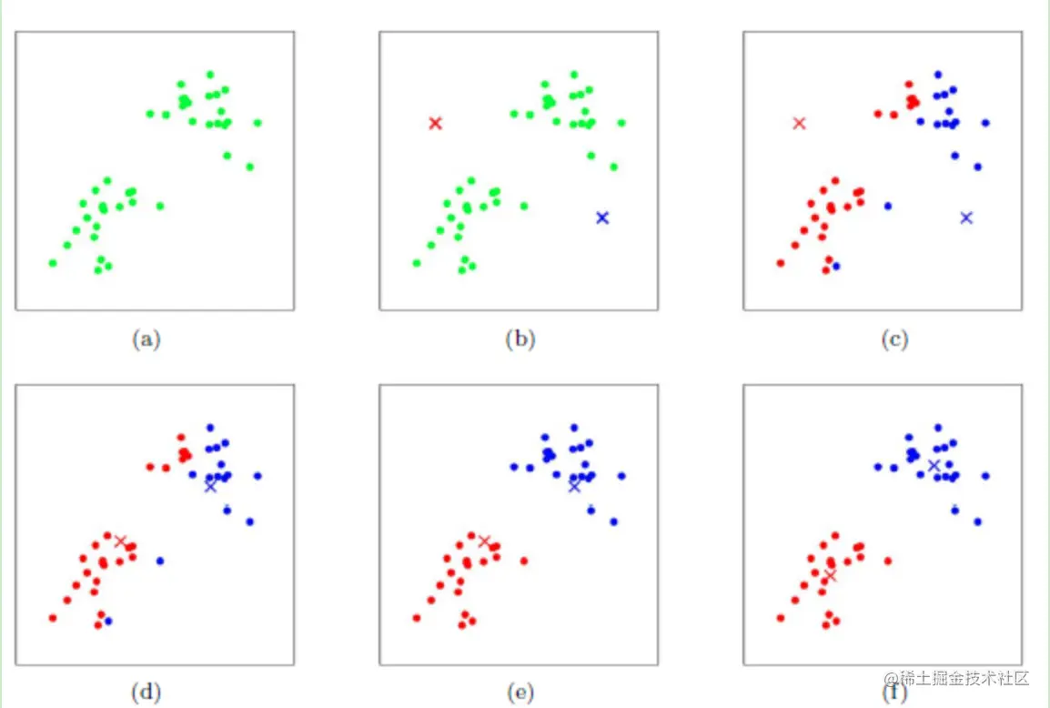 - 重复上面两个步骤,直到中心点不再变化。
