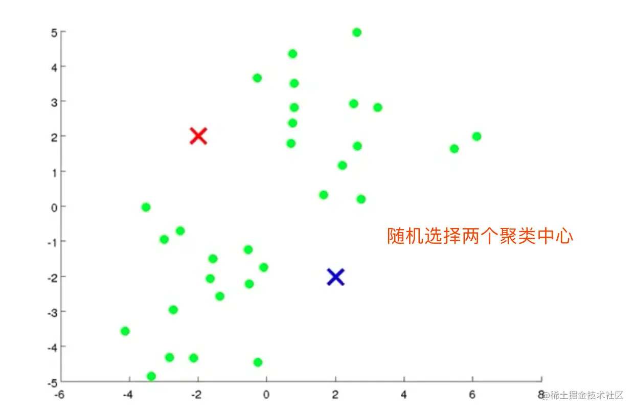 - 给定需要划分的数据,随机确定两个聚类中心点