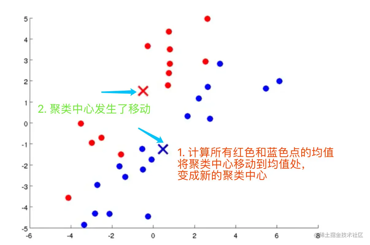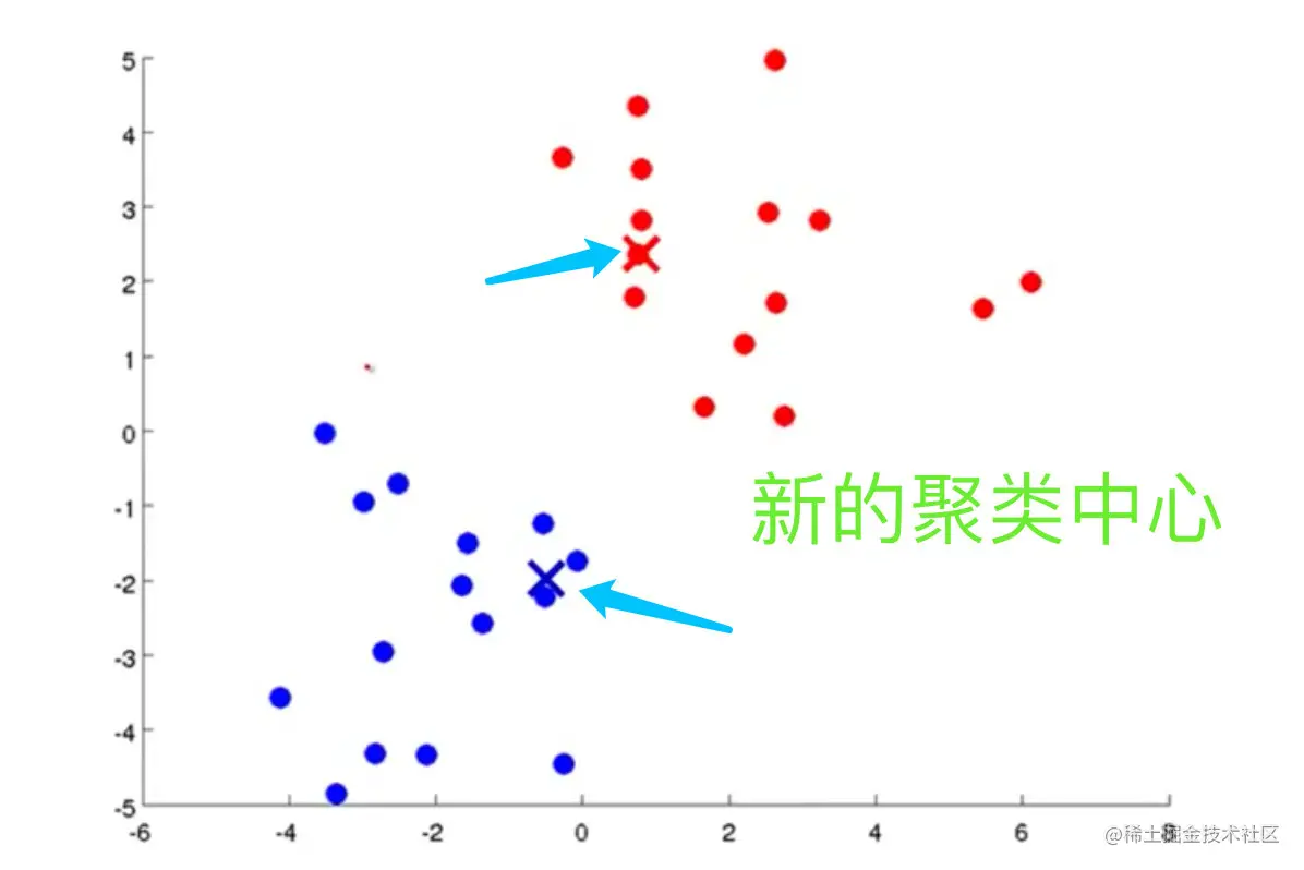 # 聚类中心的移动,重新计算该类的质心