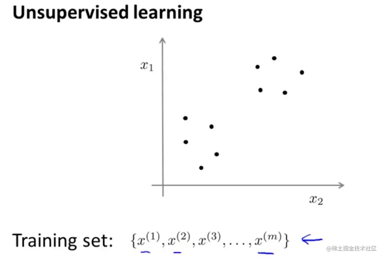 比如下面的数据中,横纵轴都是,没有标签(输出)。在非监督学习中,我们需要将一系列无标签的训练数据,输入到一个算法中,快速这个数据的中找到其内在数据结构。