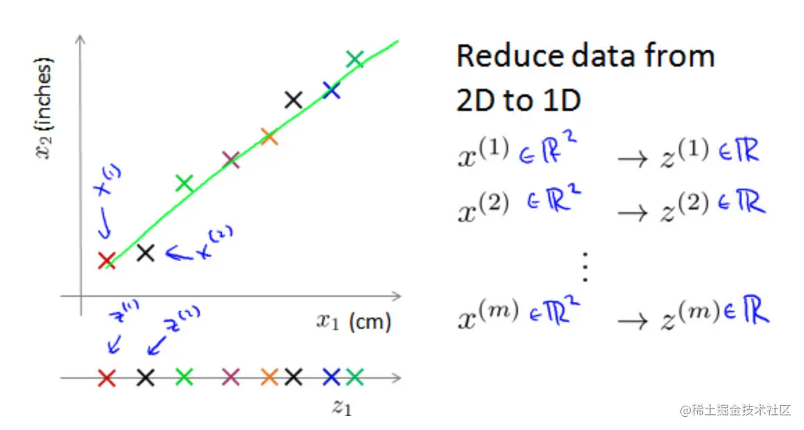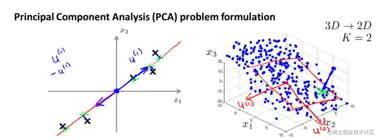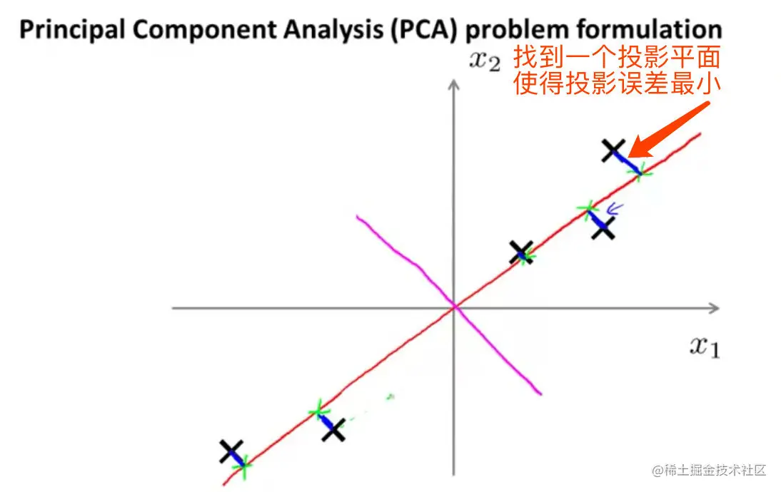 在PCA中,要做的是找到一个方向向量(Vector direction),当把所有的数据都投射到该向量上时,PCA的关键点就是找到一个投影平面使得投影误差最小化。