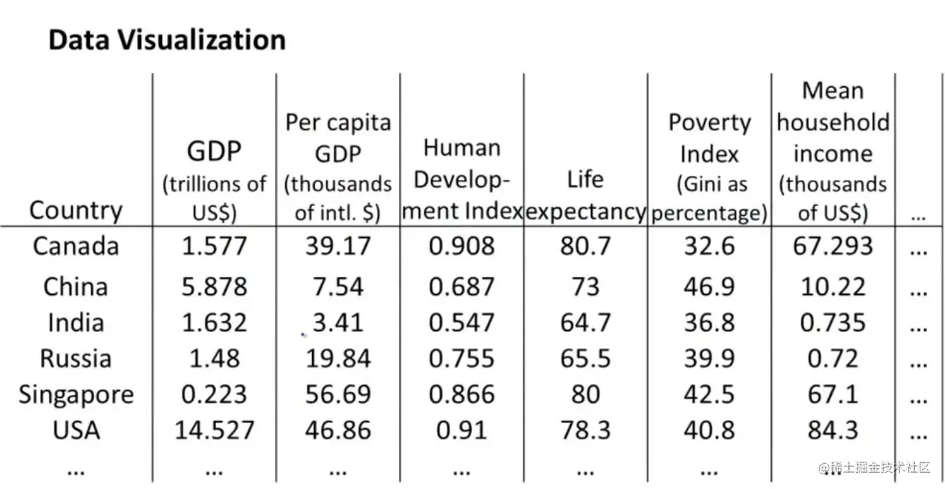 - 某些属性表示的含义可能相同,在图形中可以放到同一个轴上,进行数据的降维