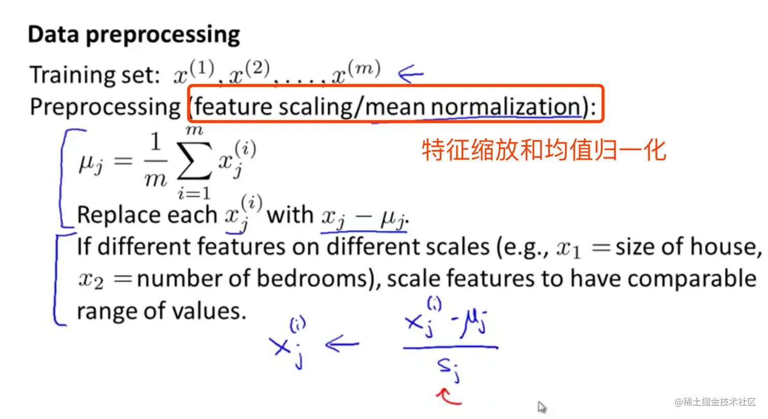 均值归一化。计算所有特征的均值,令,如果特征不在一个数量级上,需要除以标准差