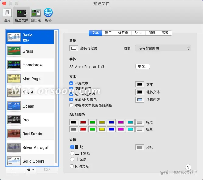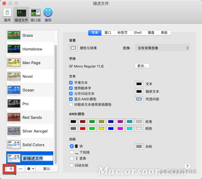 用户可以使用描述文件来自定“终端”窗口的颜色、字体、光标样式、背景和其他元素。描述文件是“终端”窗口的样式和行为设置的集合。