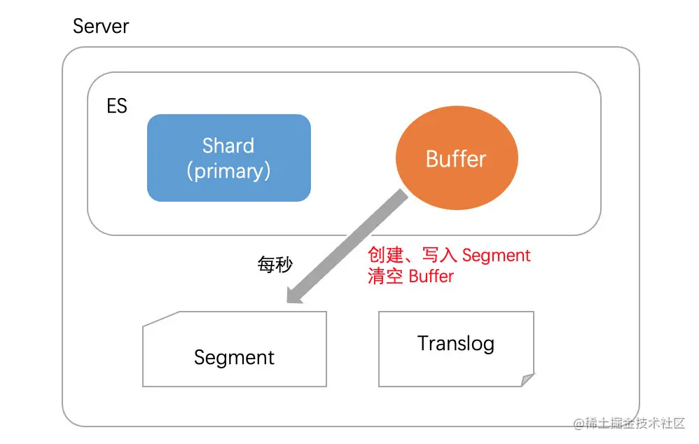 ES 每隔一秒执行一次 refresh 操作,会创建一个 Segment 文件,将 buffer 中的数据写入这个 segment,并清空 buffer。