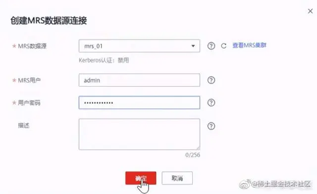 3. 选择前序步骤创建名为的“MRS01”数据源,用户名:admin,密码:Huawei@12345,单击“确定”,创建成功。
