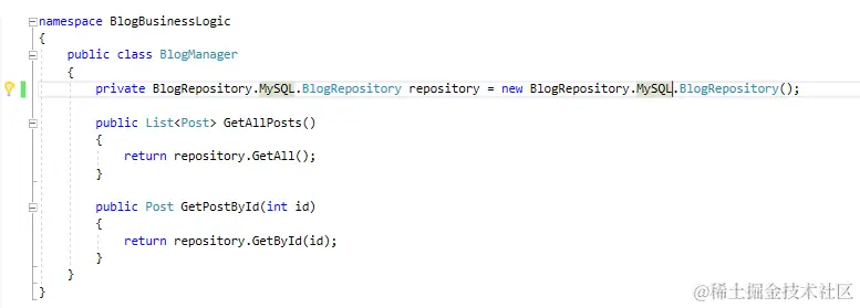 3. 变更逻辑层的引用,使用BlogRepository.MySQL,并修改错误的命名空间: