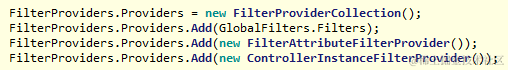 ● 过滤器提供器集合(FilterProviderCollection):它包含了上述的所有过滤器提供器,ActionInvoker就是通过它来获取所有相关过滤器的:
