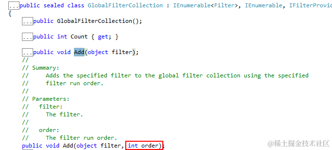 ○ GlobalFilterCollection:用于保存全局过滤器实例,可以直接通过它添加和获取过滤器实例,通过它创建的过滤器的Scope为Gobal,创建时可以通过Order参数来决定全局过滤器的执行顺序: