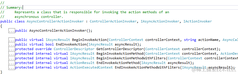 它除了异步功能外还继承了同步的ControllerActionInvoker类型,异步主要是为了提高请求处理的吞吐量,这里将使用同步版本的代码进行Action与Filter执行介绍。