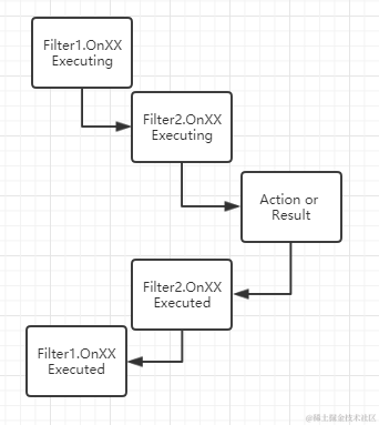 在Action和Result过滤器的定义中都有两个方法,分别是OnXXXExecuting以及OnXXXExecuted,它们对应Action或者Reuslt执行前和执行后。当一个Action上存在多个Action或者Result过滤器时就会形成一个过滤器管道,其执行方式如下图所示:
