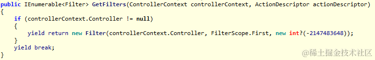 23 FilterInfo filters = this.GetFilters(controllerContext, actionDescriptor);//获取所有过滤器