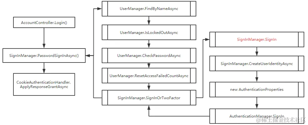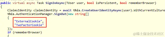 以上就是三种身份验证的执行流程,虽然它们流程不同,但最后目的是一致的,在每一种身份验证流程最后都是通过SignInManager的SignIn方法完成的登录,即无论什么方式登录的,最终都会将身份信息以Cookie的形式保存在名为.AspNet.ApplicationCookie的Cookie中。并且该方法会将双因子验证以及外部Cookie验证的信息都清除: