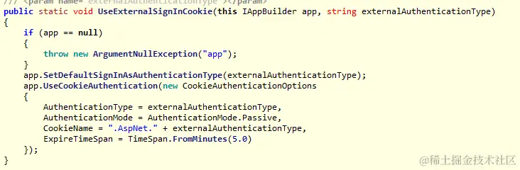 1. 首先需要提到的是模板项目在身份验证管道中通过app.UseExternalSignInCookie方法设置了默认的登录验证方式(ExternalCookie)以及添加了一个消极模式的Cookie验证中间件,其验证方式也是ExternalCookie。