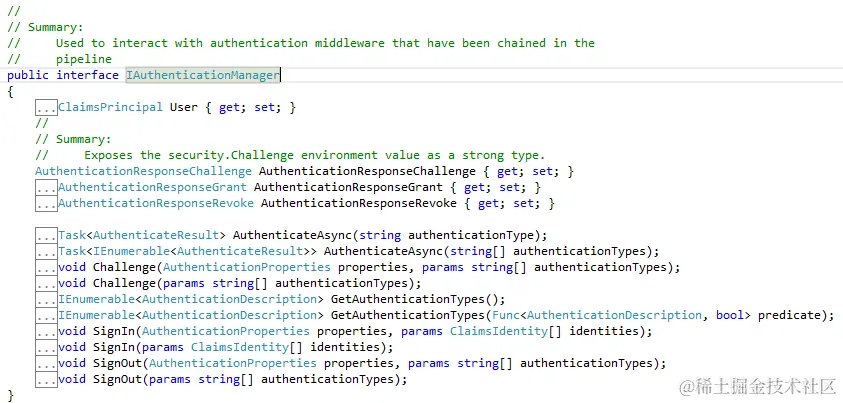 AuthenticationManager作为Owin中身份验证的业务的核心,其接口定义如下: