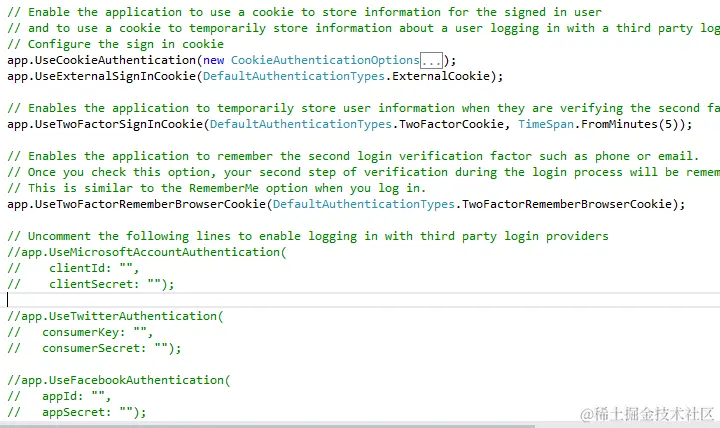 为什么本章以Identity的多重身份验证为题?因为ASP.NET Identity是基于Owin通过中间件的形式实现的身份验证,以下是默认模板中添加的代码: