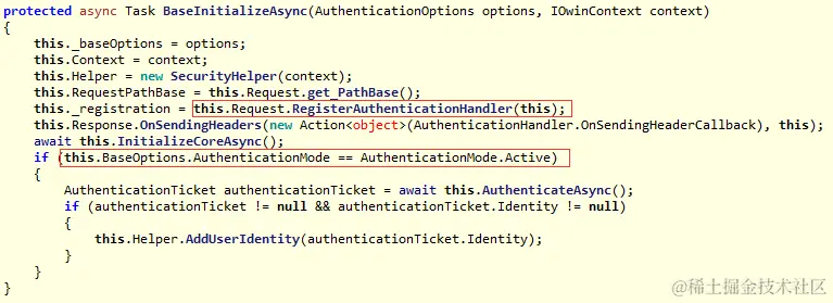 1. 初始化:将当前处理器注册到AuthenticationManager中,另外如果当前中间件的模式为积极模式,那么调用身份验证方法,否则身份验证方法就只能通过AuthenticationManager调用。(注:InitializeCoreAsync的具体实现在子类中)
