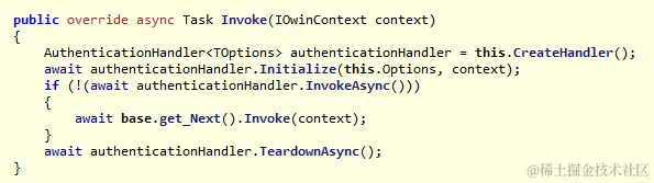 从上面的分析可以知道,在身份验证处理其中有一个专门用于身份验证的方法AuthenticateAsync,那么执行方法是做什么用的呢?在基于Identity的ASP.NET应用程序中身份验证方法只有在积极模式下时才会对自动对请求进行身份验证,并且无论是否通过验证都不会对请求进行任何的处理(即使没有通过身份验证仍旧能够将请求送到Controller、Action的执行,因为它们是可以被匿名调用的),而有一种情况就是当服务器处理请求时就能够确定该请求应该如何处理,如通过第三方账户登录后会在Url的查询字符串上携带一些Token等信息,那么这个时候能够确定的就是需要根据这些信息进行处理进而完成身份验证而不是还可以将请求交给Controler处理,在这种情况下就可以将这些处理的逻辑放到Invoke方法中,Invoke方法如果返回true时,管道将不再继续往下执行(见中间件的Invoke方法)。微软、Google等社交账户验证时,它的验证逻辑是写在这个InvokeAsync方法中的,而Cookie验证的中间件就默认返回false将请求交与后续组件处理,后续详细介绍Owin的第三方验证。