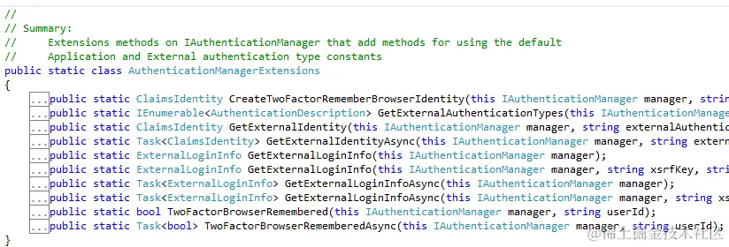 AuthenticationManagerExtensions是对AuthenticationManager的拓展,主要是对AuthenticationManager添加了外部验证以及双因子验证的补充支持,这些拓展方法被SignInManager以及身份验证Controller使用:
