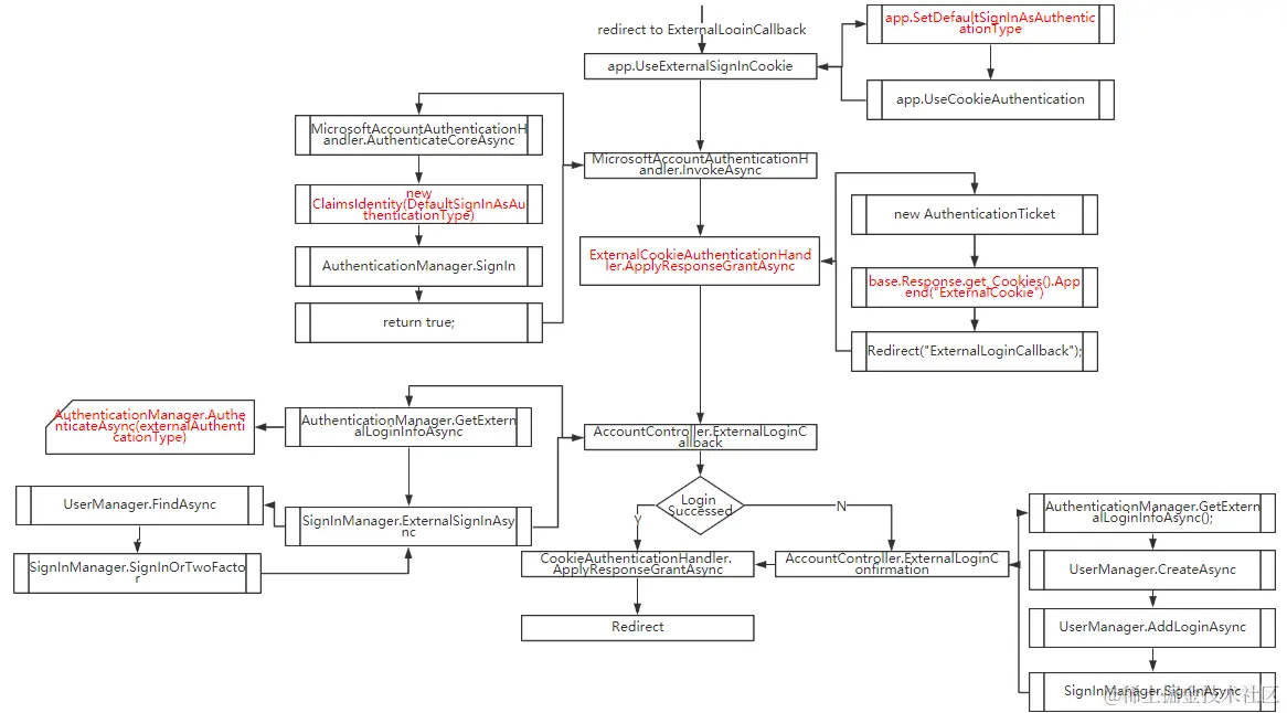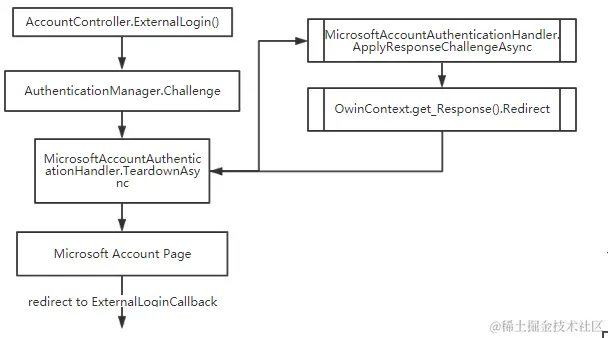 当第三方登录成功后会重定回AccountController的ExternalLoginCallback,整个流程的说明如下: