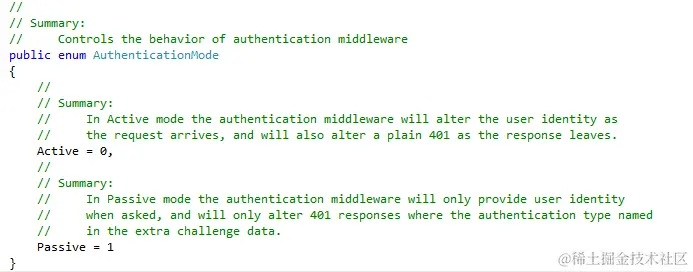 Identity是基于Owin实现身份验证的,所以实际上Owin才是身份验证规则的制定者,Identity只不过是实现的一种,在Owin中把身份验证中间件分为两个模式,分别是积极模式与消极模式,两个模式是通过一个名为AuthenticationMode的枚举类型定义的: