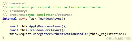 3. 销毁:当请求处于返回阶段时,会触发身份验证处理器的销毁过程,整个过程包括将身份信息写入响应信息中(如Cookie验证会将AuthenticationTicket对象序列化加密后写到Cookie中),并执行子类的一些销毁逻辑,最后将添加到AuthenticationManager中的处理器删除。
