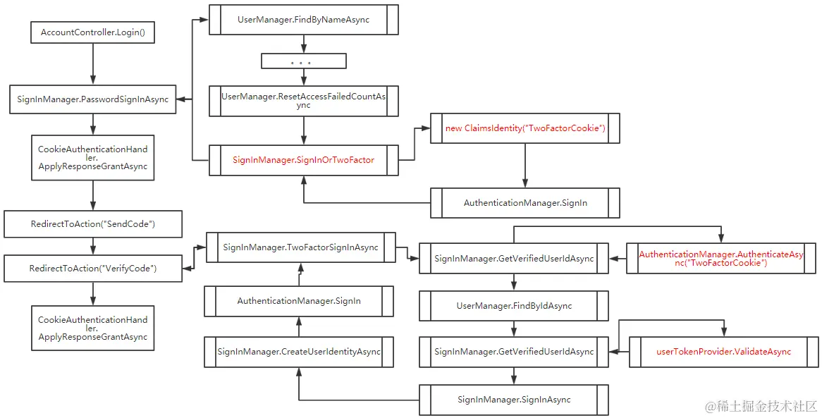 1. 在首次登录时和普通验证一样,需要对用户密码、是否被锁定等信息进行验证,然后因为需要双因子验证,所以创建了一个TwoFactorCookie的身份信息并执行了管理器的SignIn方法,该信息保存了通过密码验证的用户名。完成请求后, app.UseTwoFactorSignInCookie方法添加Cookie验证中间件将会把上面创建的TwoFactorCookie身份信息写到Cookie中(注:在管道中添加了多个cookie的验证中间件,但是它的配置和身份验证类型是不同的,这里是根据用户信息的身份验证方式来选择使用哪一个中间件来处理生成Cookie,而ClaimsIdentity构造传入的值就是身份验证方式)。